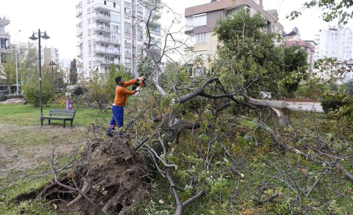 Meteorolojinin ‘Turuncu kod’la uyardığı Antalya’da hafta sonu şiddetli yağış ve fırtına etkili oldu. Aksu, Serik, Manavgat ve Alanya’da sera ve tarım zarar görünken Muratpaşa’da da Yeşilbahçe Mahallesi’nde hortum parkları vurdu. Parklarda bulunan 20’ye yakın ağaç devrildi. Hortum bazı ağaçları kökünden söktü. Hafta sonunu teyakkuzda geçiren Muratpaşa Belediyesi ekipleri, yeni haftanın ilk mesai saatleriyle birlikte parklarda hortumun izlerini ortadan kaldırmak için çalışmalara başladı. Kökünden sökülen ağaçlar kesilerek kepçelerle kamyonlara taşındı. Muratpaşa Belediyesi, temizlik çalışmalarının ardından parkların yenileme çalışmalarına başlayacak.