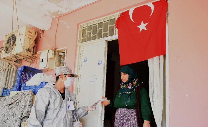 Muratpaşa’nın en kalabalık mahallesi Güzeloba’yla birlikte Fener ve Çağlayan’da ekipler, günün ilk saatleriyle birlikte her siteye, apartmana girerek kapı kapı maskeleri dağıttı. Yüzde yüz pamuklu kumaştan yıkanabilir olarak üretilen maskeler üçerli paketlenmiş halde kapı kollarına asılıyor. Aynı zamanda dağıtımın yapıldığı her apartman da, “Evde kal” çağrısıyla birlikte sokağa çıkmak durumunda olanların maske takmaları, hijyen ve mesafe kullarına uymaları konusunda bilgilerin yer aldığı çıkartma da asılıyor.