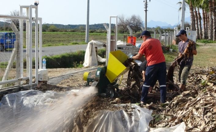Manavgatlı muz üreticisi muz serasının atıklarını makine ile öğütüp malçlama yapmak suretiyle potasyum gübreye dönüştürüyor.