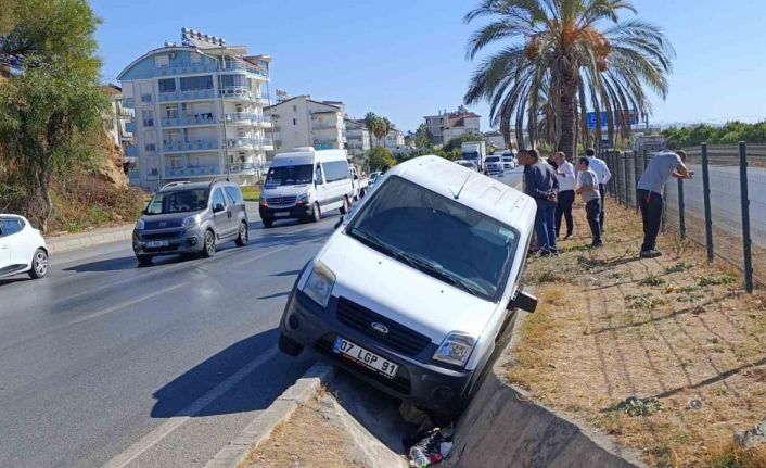 Kaza; Alanya-Antalya D-400 kara yolunda meydana geldi. Edinilen bilgiye göre, 07 LGP 91 plakalı hafif ticari araç aynı istikamette gitmekte olan bir kamyonete çarpmamak için direksiyonunu kırdı. Hafif ticari araç, kamyonetin kasasına çarpıp refüjdeki yağmur suyu tahliye kanalına düşerken, sürücüsü şans eseri kazayı yara almadan atlattı.