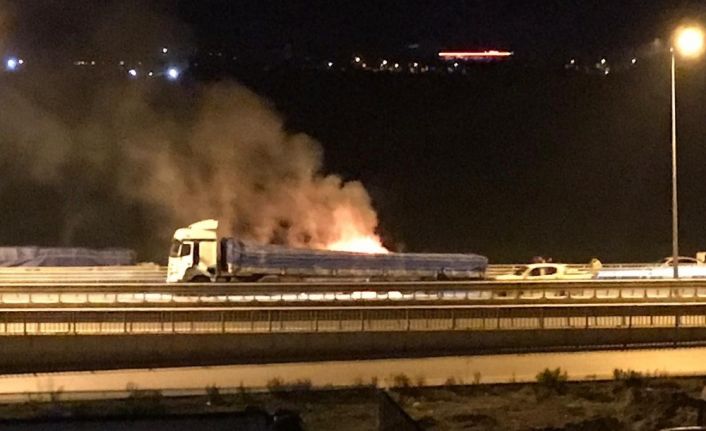 Edinilen bilgiye göre, Denizli’den Anamur’a sera demiri taşıyan Latif Demir yönetimindeki 20 VB 281 plaka ve 20 VB 688 dorse plakalı tırın dorsesinin lastiği, Sanayi Köprülü üst kavşağı girişinde patladı. Aracın yola devam etmesi ve lastiğin alev alması sonucu tırın dorsesinde yangın çıktı. İhbar üzerine olay yerine polis ve itfaiye ekipleri sevk edildi. Polis üst geçidi trafiğe kapatırken, itfaiye ekipleri de yangını büyümeden söndürdü. Yangın sonucu tırın dorse bölümünde hasar oluştu. Tırın yükünün demir olması yangında zararın büyümesini önledi. Tır şoförü Latif Demir, Mersin’in Anamur ilçesine sera demiri götürdüğünü Manavgat’ta tırın lastiğinin patladığını ve ardından yangının çıktığını söyledi.