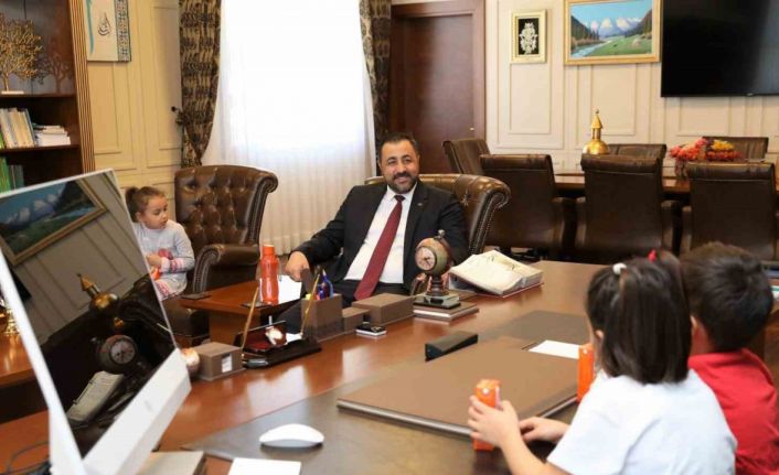 23 Nisan Ulusal Egemenlik ve Çocuk Bayramı dolayısıyla ALKÜ Uygulama Anaokulu öğrenci ve öğretmenleri ALKÜ Rektörü Prof. Dr. Ekrem Kalan’a ziyarette bulundu. 23 Nisan Ulusal Egemenlik ve Çocuk Bayramı dolayısı ile her yıl olduğu gibi bu yıl da makam koltukları bir günlüğüne çocuklara devredildi. Kalan, bu yıl makam koltuğunu ALKÜ Uygulama Anaokulu öğrencisi Can İlhan ve Deniz Mercan Akdenizli’ye devretti. Günün anlam ve önemi çerçevesinde öğrenciler ile bir araya gelen Rektör Kalan, minik öğrenciler ile tek tek sohbet etti. Rektör Kalan’ın öğrencilere yönelttiği sorulara verilen yanıtlar ise ortamda neşeli anlara sahne oldu.