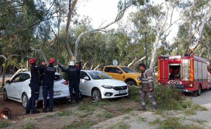 Antalya’da şiddetli rüzgarın etkisiyle park halindeki 2 aracın üzerine ağaç devrildi.
