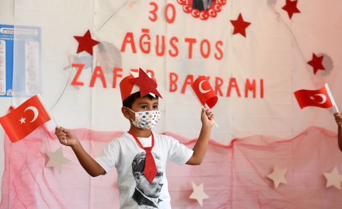 Yaz döneminde de eğitime devam eden kreşte, 23 Nisan’dan 19 Mayıs’a, bayramları birlikte kutlayan öğrenciler, 30 Ağustos Zafer Bayramı için de öğretmenleriyle özel bir gösteri hazırladı. Bayram için Gazi Mustafa Kemal Atatürk fotoğraflı bir pano yapan çocuklar, sosyal mesafenin hulahoplarla sağlandığı gösteride ellerinde Türk bayrakları, yıldızlı taçlarıyla şiirler okuyup marşlar söyledi.