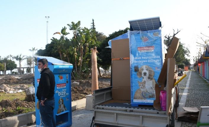 Kemer Belediyesi, sokak hayvanlarının beslenmesini kolaylaştırmak amacıyla ilçede belirlenen yerlere güneş enerjisiyle çalışan mama kumbaraları monte etti.