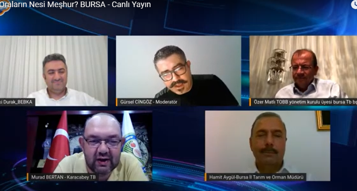 Antalya Ticaret Borsası ile Antalya Tarım ve Orman Müdürlüğü işbirliğinde düzenlenen “Sizin Oraların Nesi Meşhur?” programında bu hafta Bursa’nın yöresel ve coğrafi işaretli ürünleri konuşuldu. Gürsel Cingöz moderatörlüğünde düzenlenen programa, Bursa Ticaret Borsası Başkanı ve TOBB Yönetim Kurulu Üyesi Özer Matlı, Karacabey Ticaret Borsası Başkanı Murat Bertan, Gemlik Ticaret Borsası Başkanı Özden Çakır, Mustafakemalpaşa Ticaret ve Sanayi Odası Başkanı Tekin Uzkınay, İnegöl Ticaret ve Sanayi Odası Başkanı Yavuz Uğurdağ, Bursa, Eskişehir, Bilecik Kalkınma Ajansı (BEBKA) Genel Sekreteri Muhammet Zeki Durak, Bursa Tarım ve Orman İl Müdürü Hamit Aygül, Bursalı sanatçılar Tarık Tarcan ile Fettah Can konuk olarak katıldı.