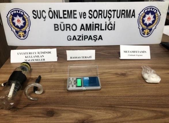 Antalya Cumhuriyet Başsavcılığı koordinesinde, Gazipaşa İlçe Emniyet Müdürlüğü ekipleri, uyuşturucu veya uyarıcı madde ticareti yapan şahıs ve gruplara yönelik çalışma yaptı. Çalışmalarda, O.G. ve D.G. isimli şahısların Manavgat’tan uyuşturucu madde getirerek Gazipaşa’da satacakları yönünde ihbar alındı. İhbarı değerlendirilen ekipler, şüpheli şahısların kullanmış olduğu aracı Cumhuriyet Mahallesi’nde yakaladı. Araçta ve şahısların üzerinde yapılan aramalarda, satışa hazır vaziyette toplam 14 gram metamfetamin, 1 adet hassas terazi ile uyuşturucu madde içmek için kullanılan cam aparat ele geçirildi.