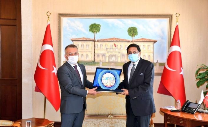 Hindistan Ankara Büyükelçisi Sanjay Panda’yı makamında ağırlayan, Antalya Valisi Vali Ersin Yazıcı,