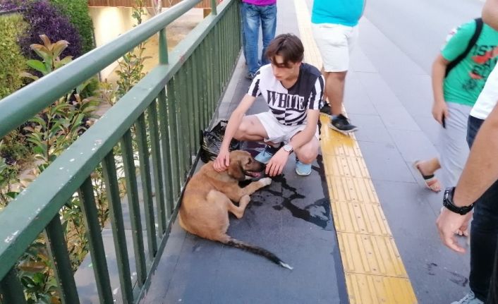 Antalya’nın Manavgat ilçesinde vicdansız sürücünün çarpıp kaçtığı sokak köpeğine yoldan geçen gençler sahip çıktı. Köpeği yoldan kaldırıp su veren gençler, barınak görevlileri gelinceye kadar da yaralı köpeğin başından ayrılmadı.