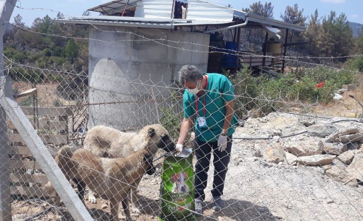 Alanya Belediyesi Veteriner İşleri Müdürlüğü’ne bağlı ekipler, yangın afetinin etkili olduğu Bayır Mahallesi’nde, sokak hayvanları için çalışıyor.