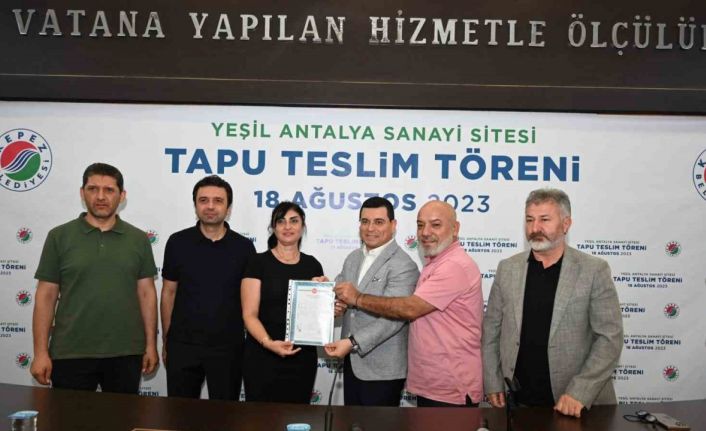 Yeşil Antalya Sanayi Sitesi Tapu Teslim Töreni, Kepez Belediyesi meclis salonunda gerçekleştirildi. Sanayi esnafının yıllardır özlemle beklediği tapuların tamamı hak sahiplerine teslim edildi. Yeşil Antalya Sanayi Sitesi Tapu Teslim Törenine AK Parti Antalya Milletvekili Mustafa Köse, Kepez Belediye Başkanı Hakan Tütüncü, AK Parti İl Başkanı Ali Çetin, AK Parti Kepez İlçe Başkanı Bahattin Bayraktar, Meclis üyeleri, Muhtarlar, Yeşil Antalya Sanayi Sitesi Kooperatif Başkanı İbrahim Tetikoğlu, yönetim kurulu ve çok sayıda sanayi esnafı katıldı.