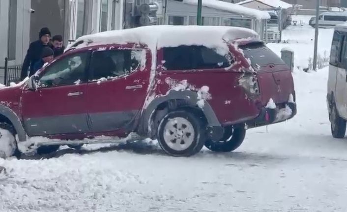 Ardahan’ın Çıldır ilçesinde yoğun kar yağışı sonrası oluşan buzlanma nedeniyle araçlar yolda kaldı.