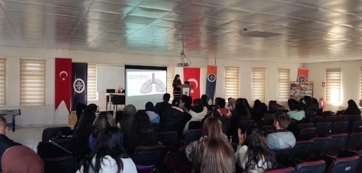Akciğer kanseri farkındalık ayı bağlamında Akciğer kanseri nedir? Akciğer kanserinin türleri, belirtileri, risk faktörleri, tanı ve tedavileri hakkında, Hemşire Esra Demircan tarafından öğrencilere sunum yapıldı.