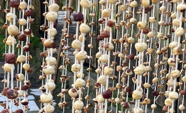 Artvin’in Arhavi ilçesinde kadınlar imece usulü köme pestil yapımına başladı. Ceviz ve fındıklar ince işçilikle iplere geçilirken, geleneksel yöntemlerle birçok aşamadan geçtikten sonra sofralarda yerini alıyor.