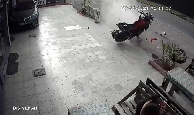 Hızla gelen motosiklet sürücüsünün önce aydınlatma direğine çarptığı daha sonra ise kaldırım üzerine savrulduğu görüldü. Öte yandan görüntülerde, motosikletin hızla üzerine geldiğini gören vatandaşların kaçma anı da görüntülere yansıdı. Kazayı gören vatandaşlar ise yardım etmeye koştu. O sırada kazanın etkisiyle savrulan motosikletin bir parçası bankta oturan 2 kadını teğet geçti. Kadınlar adeta ölümden dönerken, korku ve panik halinde bulundukları yerden kalktılar.