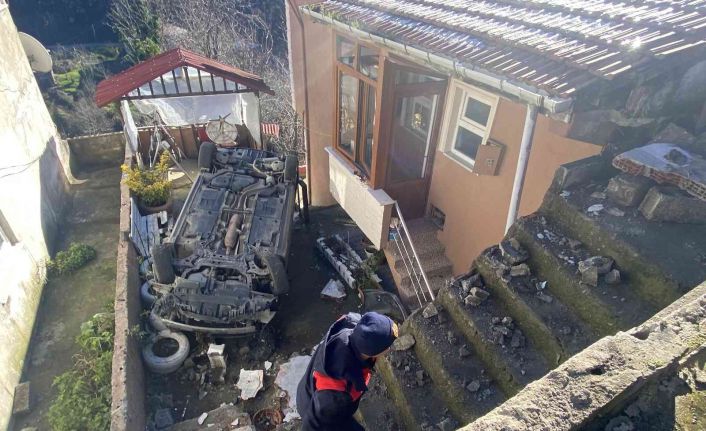 Zonguldak’ta sürücünün kontrolünden çıkan otomobil 10 metre yükseklikten bir evin önüne düştü. Kazada araç sürücüsü E.Ö(50)ve yanında bulunan eşi R.Ö(50) hafif şekilde yaralandı.