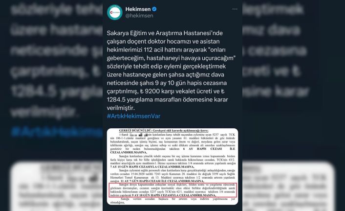 HEKİMSEN tarafından konuya ilişkin sosyal medya hesabı üzerinden yapılan paylaşımda, “Sakarya Eğitim ve Araştırma Hastanesinde çalışan doçent doktor hocamızı ve asistan hekimlerimizi 112 Acil hattını arayarak ‘Onları geberteceğim, hastaneyi havaya uçuracağım’ sözleriyle tehdit edip eylemi gerçekleştirmek üzere hastaneye gelen şahsa açtığımız dava neticesinde şahıs, 9 ay 10 gün hapis cezasına çarptırılmış. 9 bin 200 TL karşı vekalet ücreti ve bin 284,5 TL yargılama masrafları ödemesine karar verilmiştir” ifadelerine yer verildi.