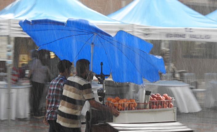 Meteoroloji Genel Müdürlüğünün Trakya Bölgesi için günlerdir uyarılarda bulunduğu sağanak yağış, Edirne’de kısa sürede etkili oldu. Akşam saatlerinde fırtınanın ardından başlayan sağanak yağış 15 dakika sürdü. Yağmura hazırlıksız yakalanan vatandaşlar zor anlar yaşadı. Birçok vatandaş işyerlerinin içine girerek yağmurdan korunmaya çalıştı. Yağmura hazırlıksız yakalanan vatandaşlar tarihi çarşılara sığınırken, kimisi çareyi şal, kimisi ise şemsiye satın almakta buldu.