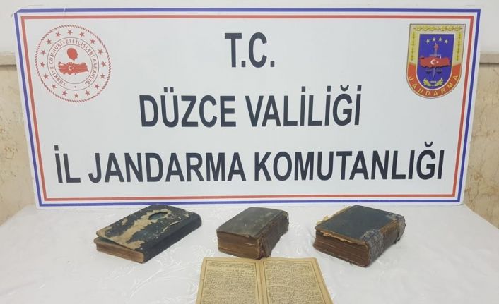 DÜZCE(İHA) – Düzce İl Jandarma Komutanlığına bağlı ekipler durdurdukları araç içinde 1800’lü yıllara ait 4 adet el yazması dini tavsiyeler kitabı ele geçirildi.