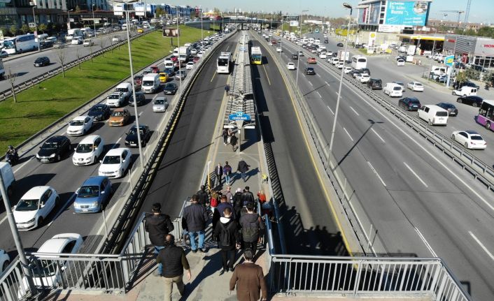 Durakta bekleyen vatandaşlar metrobüslere binmek için birbiriyle yarışırken, sosyal mesafe kuralı hiçe sayıldı. Kısıtlama saati öncesinde toplu taşıma duraklarında oluşan yoğunluk havadan görüntülendi.