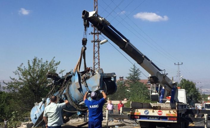 Kayseri’nin Hacılar ilçesine bağlı Erciyes Caddesi’nde meydana gelen ve 4 kişinin hayatını kaybettiği kazada, evin yıkılmasına neden olan iş makinesi vinç yardımı ile bulunduğu yerden kaldırıldı.
