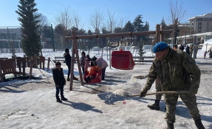 MSB’nin sosyal medya hesabından yapılan paylaşımda, “Tekirdağ’da konuşlu bulunan 41’inci Komando Tugay Komutanlığı Malatya’da aralıksız şekilde yardım faaliyetlerine destek olmaya devam ediyor. Komandolarımız Malatya Millet Bahçesinde gıda ve erzak dağıtımı yapılarak parkta oynayan çocukların güvenliği için parkın zeminini tuzladı” denildi.