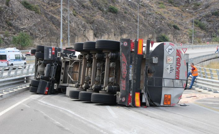 Amasya’da seyir halinde olan asfalt yüklü tanker, bağlantı köprüsünün üstünde devrildi. 70 metre sürüklenen tankerin sürücüsü taktığı emniyet kemeri sayesinde kazayı burnu bile kanamadan atlattı.
