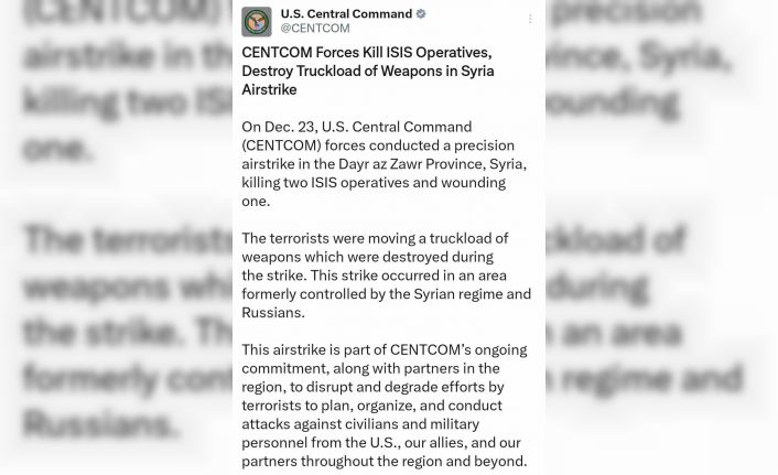 ABD Merkez Kuvvetler Komutanlığı (CENTCOM), Suriye’nin Dayr az Zawr bölgesinde bulunan bir DEAŞ hedefine yönelik hassas hava saldırısı gerçekleştirildiğini duyurdu. CENTCOM’dan yapılan açıklamada, daha önce Suriye rejimi ve Rusya tarafından kontrol edilen bir bölgede gerçekleşen saldırıda 2 DEAŞ’lı teröristin öldürüldüğü, 1’inin ise yaralandığı belirtildi. Silah dolu bir kamyonun da saldırıda imha edildiği kaydedilen açıklamada, “Bu hava saldırısı, bölgedeki ortaklarıyla birlikte CENTCOM’un teröristlerin ABD, müttefikleri ve ortaklarına yönelik sivil ve askeri saldırı planlama, organize etme ve gerçekleştirme kabiliyetlerini azaltma ve engelleme taahhüdünün bir parçasıdır” denildi.
