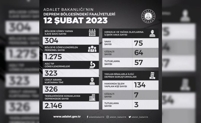 Adalet Bakanlığı sosyal medya hesabından yaptığı açıklamada, bölgede 304 ilave savcının görevlendirildiğini açıkladı. Bölgeye görevlendirilen ilave personel sayısının bin 275 olarak açıklandığı paylaşımda, adli tıp görevlendirilmeleri için 323, CEKUT Arama Kurtarma timi personel sayısı 326, Adalet Bakanlığı tesislerinde konaklayan depremzede sayısı ise 2 bin 146 olarak açıklandı. Hırsızlık ve yağma olayları hakkında 75 vaka olduğu, 64 kişinin gözaltına alındığı ve 57 kişinin tutuklandığı duyuruldu. Yıkılan binalarla ilgili 134 kişi hakkında işlem yapıldığı, 7 kişinin gözaltına alındığı ve 3 kişinin tutuklandığı açıklandı.