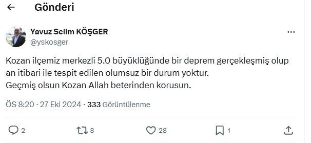 Adana’nın Kozan ilçesinde saat 20.07’de meydana gelen 5 büyüklüğündeki deprem, Adana il merkezi ve çevre illerde hissedildi. Adana Valisi Yavuz Selim Köşger, sosyal medya hesabından yaptığı açıklamada, "Kozan ilçemiz merkezli 5.0 büyüklüğünde bir deprem gerçekleşmiş olup, an itibarı ile tespit edilen olumsuz bir durum yoktur. Geçmiş olsun Kozan, Allah beterinden korusun" dedi.