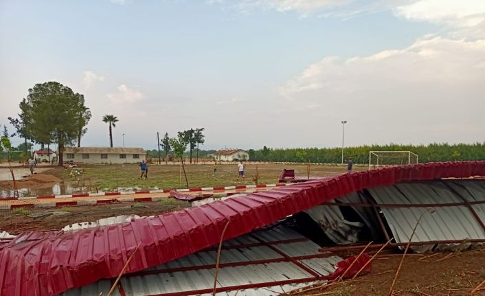 Adana’nın Kozan ilçesi Faydalı Mahallesi’nde etkili olan sağanak yağış ve fırtına nedeniyle mahallede bulunan okulun çatısı uçtu, futbol sahası kenarındaki direkler devrildi. Çıkan fırtınada facianın eşiğinden dönüldü.