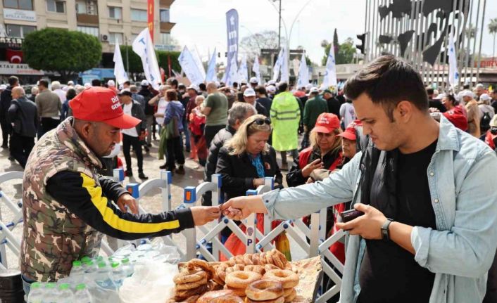 Adana’da 1 Mayıs Emek ve Dayanışma Günü’nde kutlama yapılırken ekmek parası için alanlara gelen simitçiler ise bariyerlerin arkasında çalışmaya devam etti.