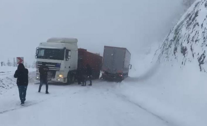 Artvin’de etkili olan kar yağışı sonrası ağır tonajlı araçların yolda kalması nedeniyle Artvin-Ardahan karayolunda aksamalar yaşandı.