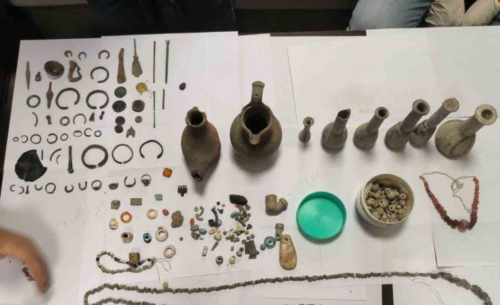 Ağrı KOM Şube müdürlüğü ekiplerince yapılan çalışmalarda tarihi eser niteliği taşıdığı değerlendirilen ve yurt dışında satılmak üzere toplanan 6 adet sikke, 6 adet şişe, 2 adet küçük testi, 2 adet yüzük, 284 adet obje, 1 adet kırmızı renkli 39 tane taş boncuğa sahip kolye, 1 adet 71 tane taş boncuğa sahip kolye, 1 adet 302 tane taş boncuğa sahip kolye ele geçirildi. Olayla ilgili gözaltına alınan 1 kişi, adli kontrol şartıyla serbest bırakıldı.