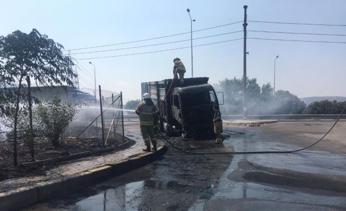 İzmir’de alev alan ahşap ürünü yüklü bir kamyon, bir anda alev topuna döndü. Yangın sonrası kamyon kullanılamaz hale geldi.