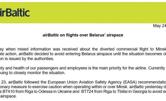 Yunanistan’ın başkenti Atina’dan Litvanya’nın başkenti Vilnius’a giden ve içerisinde 123 yolcusu bulunan Ryanair’e ait yolcu uçağı Belarus üzerinden transit geçiş yaptığı sırada başkent Minsk’e zorla iniş yaptırılmıştı. Uçakta seyahat eden ve Litvanya’da yaşayan Belaruslu muhalif gazeteci Raman Pratasevich’in gözaltına alındığı açıklanmıştı. Yaşananların ardından Letonya’nın bayrak taşıyıcı havayolu şirketi airBaltic, Atina-Vilnius seferini yapan Rynair yolcu uçağının Minsk’e zorla indirilmesinin ardından Belarus hava sahasını kullanarak gerçekleştirdiği uçuşlarını askıya aldı. Şirket tarafından yapılan açıklamada, ticari uçağın Minsk’e yönlendirildiği haberini alır almaz airBaltic’in derhal harekete geçerek durum açıklığa kavuşana ve yetkililer bir karar verene kadar Belarus hava sahasını kullanmaktan kaçınma kararı aldığı belirtildi. "Yolcularımızın ve çalışanlarımızın sağlığı ve güvenliği bizim birincil önceliğimizdir" denilen açıklamada, gelişmelere ilişkin durumu yakından takip ettikleri kaydedildi.