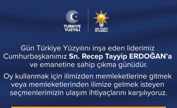 AK Parti İstanbul İl Başkanlığı’ndan yapılan açıklamaya göre, İstanbul’da yaşamasına rağmen ikameti başka şehirlerde olan seçmenlere ücretsiz ulaşım desteği verilecek. Başvurular, ilçe başkanlıklarına yapılabilecek.