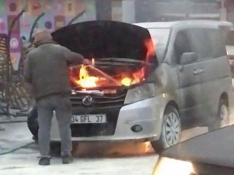 Görüntülerde, akaryakıt istasyonunda dumanlar yükselen araca görevlinin müdahale edişi yer aldı. Sonrasında ise araç istasyondan uzaklaştırıldı.