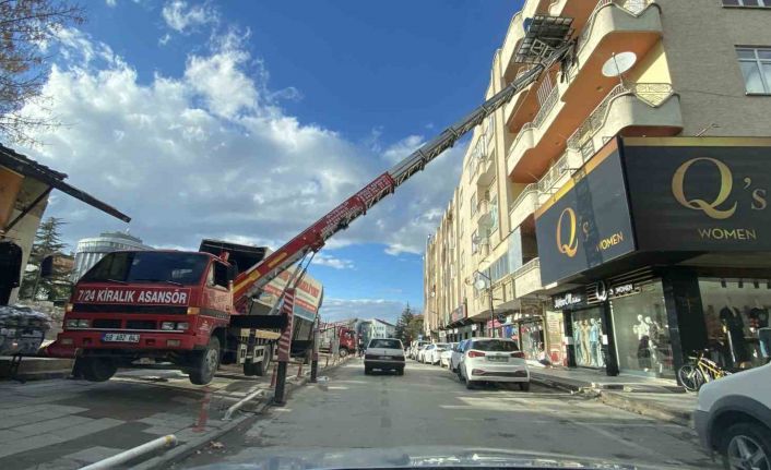 Aksaray’da taşıyacakları evin bulunduğu tek şeritli caddenin karşısına mobil eşya taşıma asansörü kuran nakliye şirketi, yolda adeta köprü vaziyeti gören asansörle araç ve yaya trafiğine açık yolda herkesin canını hiçe sayarak eşya taşıdı.