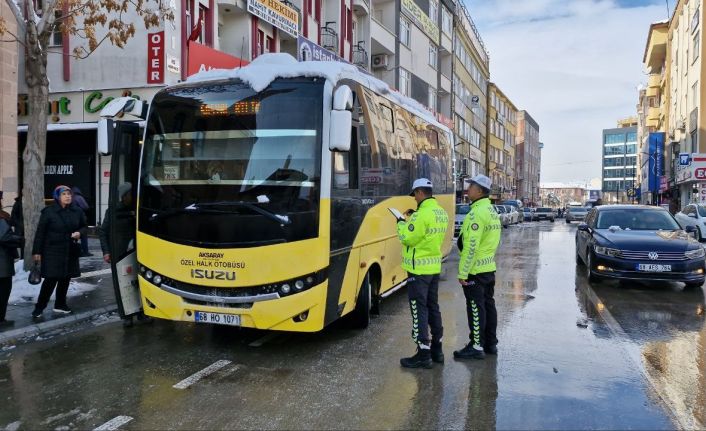Aksaray’da kar yağışının ardından şehir merkezinde don olayları ve buzlanmalar meydana gelirken, polis ekipleri toplu taşıma araçlarını kış tedbirleri yönünde uyararak denetim yaptı.