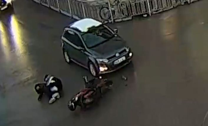 Aksaray’da elektrikli motosiklet ile otomobilin çarpışması sonucu meydana gelen ve MOBESE kameralarına yansıyan kazada çarpışmanın etkisiyle 2 genç savrularak yola düştü.