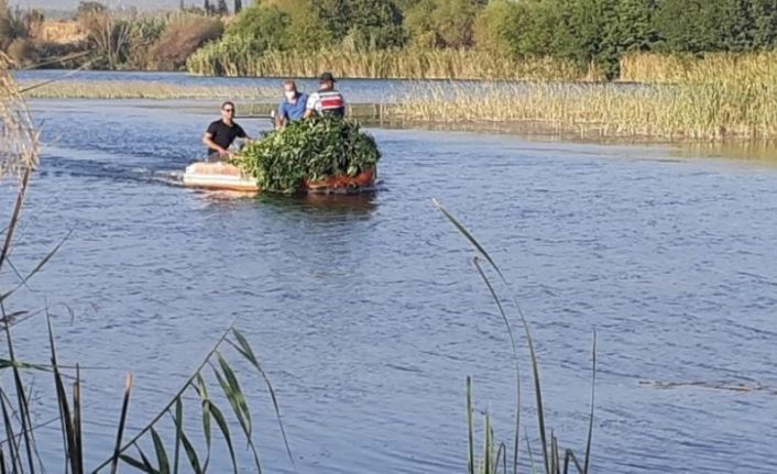 Antalya’da Aksu çayı içindeki bir toprak parçasında 585 kök hint keneviri yetiştiren 3 şüpheli yakalandı.