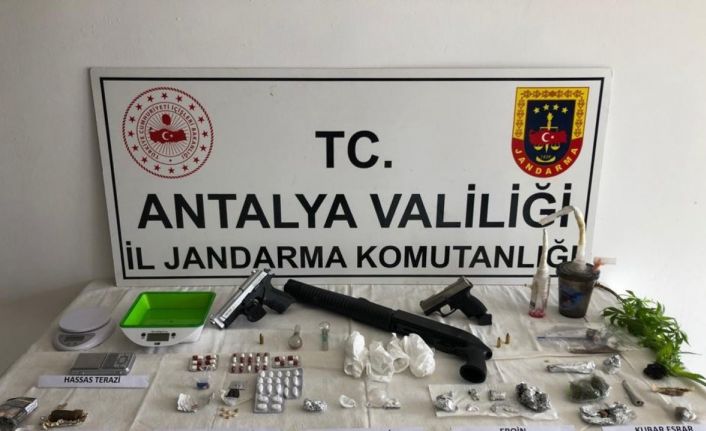 Şüphelilerin yapılan ev aramalarında; 3 adet hassas terazi, 7 gram eroin, 5 gram metamfetamin, 30 gram kubar esrar, 25 gram plaka esrar, 56 adet uyuşturucu hap, 1 kök kenevir bitkisi, 6 adet uyuşturucu kullanma aparatı, 2 adet ruhsatsız tabanca, 1 adet ruhsatsız av tüfeği ele geçirildi.