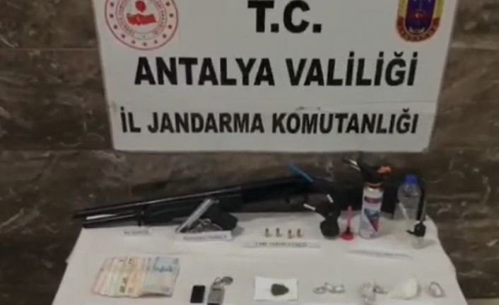 Alanya İlçe Jandarma Komutanlığına bağlı KOM timi tarafından yapılan çalışmalar sonucu Alanya ilçesi Payallar Mahallesi’nde M.A.A. (24) isimli şahısın uyuşturucu ticareti yapacağı tespit edildi. Alanya Cumhuriyet Başsavcılığı koordinesinde Jandarma KOM timi ve Konaklı Karakol Komutanlığına bağlı devriyelerce yapılan takip sonucu M.A.A., 07 AED 989 plakalı aracına binerken yakalandı. M.A.A.’nın yapılan üst ve araç aramasında, 1 adet hassas terazi, 30.5 gram metamfetamin, 5.5 gram metamfetamin, 4.2 gram metamfetamin, 0.5 gram metamfetamin, 1.3 gram esrar, 3 adet uyuşturucu hap, 1 adet kuru sıkı tabanca, 1 adet otomatik av tüfeği, 4 adet 9 milimetre tabanca fişeği, 2 adet uyuşturucu madde kullanma aparatı ele geçirildi. Yakalanan M.A.A., cumhuriyet savcısının talimatları doğrultusunda gözaltına alındı.