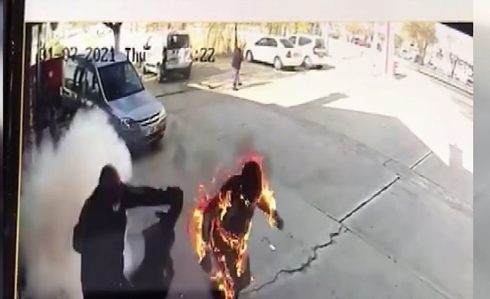 Bu arada, istasyonda çalışan 2 kişi alevler arasında kalarak yaralandı. Olay anı iş yerinin güvenlik kamerasına saniye saniye yansıdı. Görüntülerde, alev alan pompacı sağa sola koşuştururken, etrafındakiler tarafından söndürülmek isteniyor. Durumu gören bir başka iş yeri çalışanı ise yangın söndürme tüpüyle önce pompacıya, daha sonra da istasyonun yanan bölgesine müdahale ediyor.