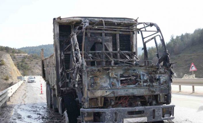 Kastamonu’da seyir halindeyken alevlere teslim olan kamyondan geriye demir yığını kaldı.
