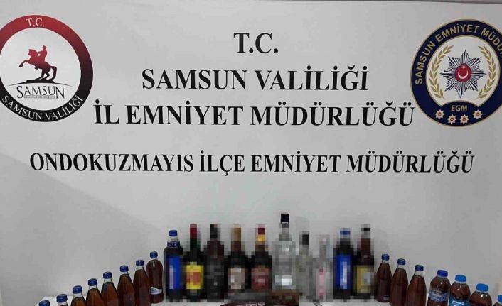 Samsun’un 19 Mayıs ilçesinde yapılan denetimde 1.64 promil alkollü olduğu belirlenen sürücünün aracından şişeler içinde el yapımı sahte içki, bıçak ve fişek ele geçirildi.