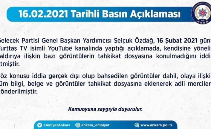 Ankara Emniyet Müdürlüğü, Gelecek Partisi Genel Başkan Yardımcısı Selçuk Özdağ’ın uğradığı saldırıya ait bazı saldırı görüntülerinin tahkikat dosyasına konulmadığını iddia etmesi üzerine bir basın açıklaması yayınlayarak, söz konusu iddianın gerçek dışı olduğunu açıkladı.