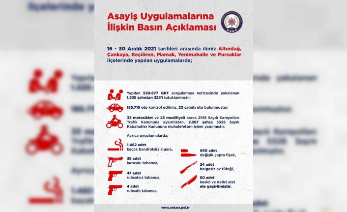 Ankara Emniyet Müdürlüğü’nün 16-30 Aralık 2021 tarihleri arasında birçok ilde yaptığı asayiş uygulamalarında yakalanan bin 525 şahıstan 325’i tutuklandı.