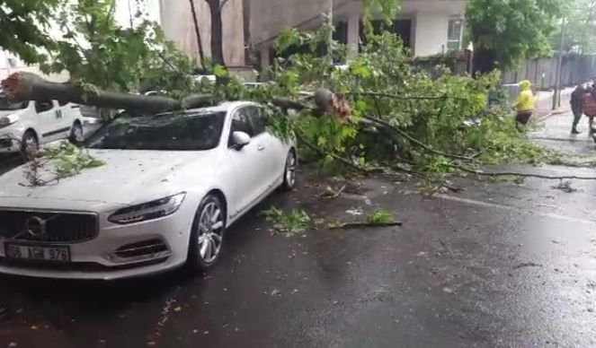 Ankara’da da şiddetli rüzgar nedeniyle devrilen ağacın altında kalan 3 araçta hasar oluştu.